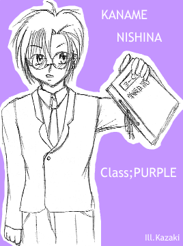 瑠香のクラスメートで委員長の要君。 彼も魔皇で、孤高の紫です。 ◆設定◆ 要に関しては説明すると長くなるので簡潔に。 前述の通り、彼は瑠香のクラスの委員長です。常備アイテムは、イラストにもある学級日誌(笑) 歳の割りに幼い顔と低めの身長がコンプレックス。 只今ひそかに瑠香に片思い中。ただし自分からアプローチするタイプではない&瑠香が鈍いので、今のままでは思いは伝わることはない… …といったところです。 ちなみに「委員長」だったり制服姿だったりするのは彼らがまだ現役の頃(つまりリアルタイムでの読参進行中)に描いたものだからです。(苦笑) |